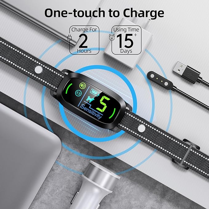 - The dog bark collar has 4 working modes; 5 adjustable sensitivity levels. Just press the M button to switch the mode at will, you can enjoy quiet time