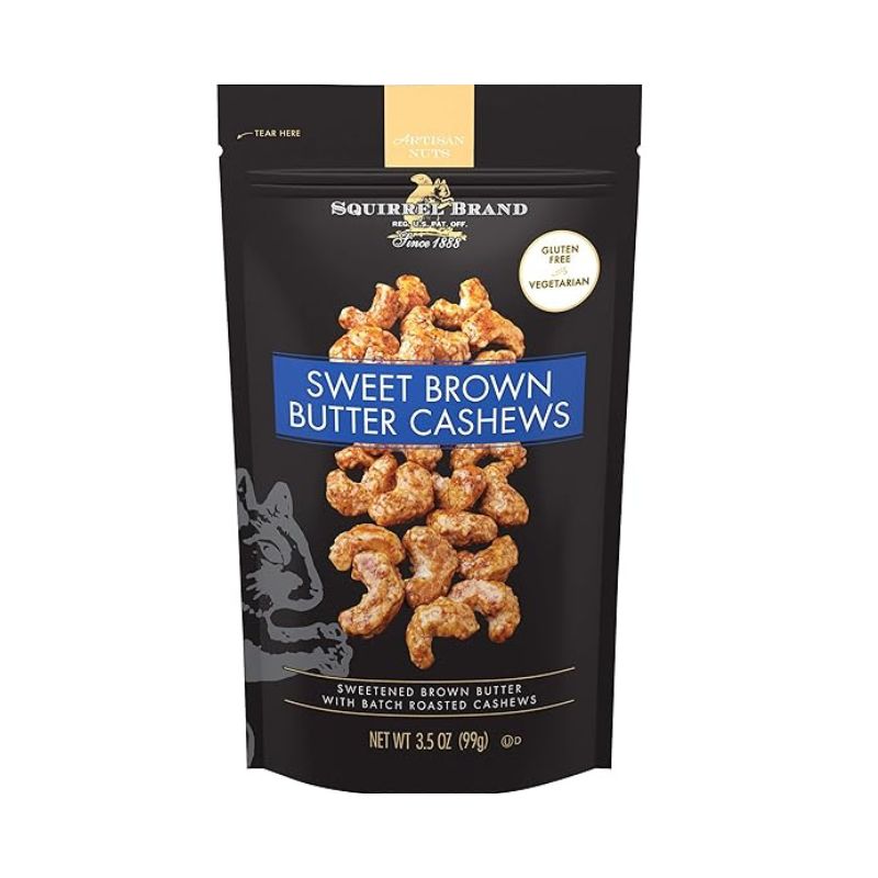 - Contains 1- 3.5 Ounce resealable stand up bag of Squirrel Brand Sweet Brown Butter Cashews