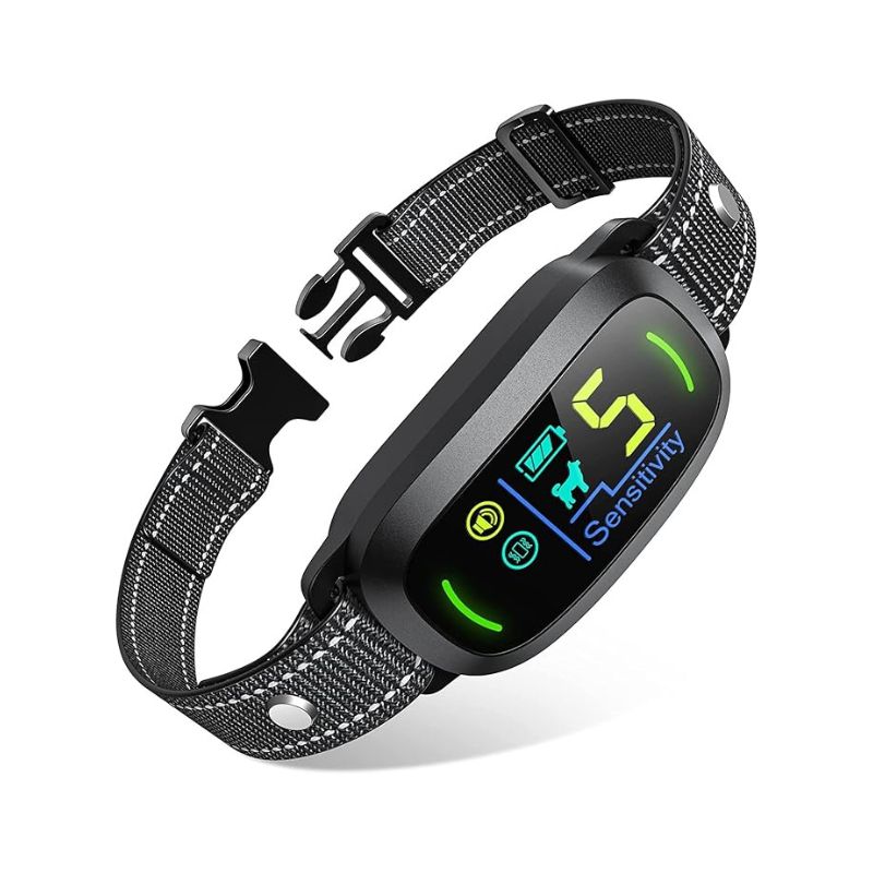 - The smart color display clearly shows the working status and power level. If the dog bark collar has been activated 6 times continuously, it will stop working for 30 seconds (the digital display changes to “8”), protecting your dog from unnecessary activation