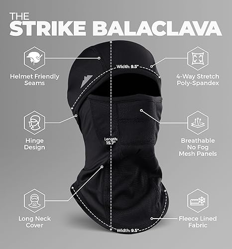 SUPERSTRETCH OSFM COMFORT: Fit and comfort is key, especially when you’re in harsh environments. Our One Size Fits Most snowboard mask is made with 4 way stretch fabric to give a snug and comfortable ‘wear all day’ fit. Warning – you might not want to take this head mask off. PERFECT FOR MOTORCYCLING: The Strike balaclava is a perfect motorcycle face mask in fall and winter. The low profile design with flatlock stitching provides great under helmet comfort. The shell outer fabric blocks wind chill, rain and sleet whilst the breathable mesh paneling prevents helmet fog. And when you stop for a coffee, the hinge design means you can easily pull the mask down whilst retaining the warmth!