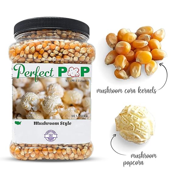 2lb container of delicious Perfect Pop Mushroom Kernels . Our Kernels are Non-GMO and proudly made in the United State of America. Extra Large sized popcorn kernels that when popped produce a mushroom style expansion . Perfect in all poppers . Great for fund raisers, charity events , at home use , or business purpose.