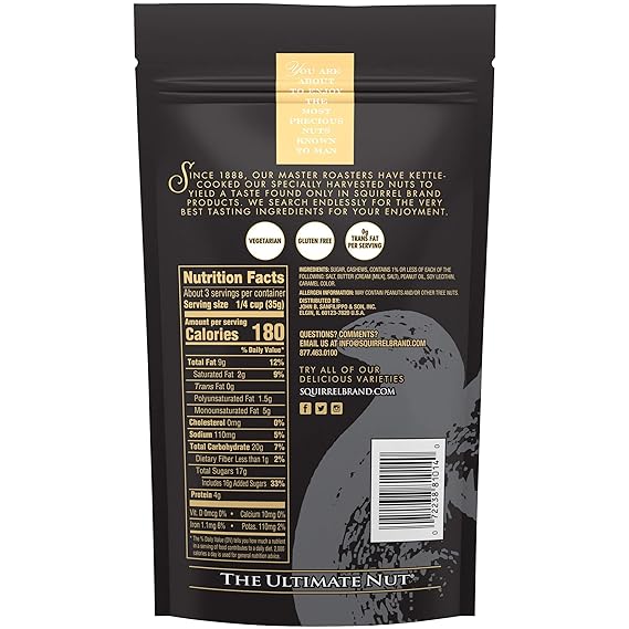 - Contains 1- 3.5 Ounce resealable stand up bag of Squirrel Brand Sweet Brown Butter Cashews